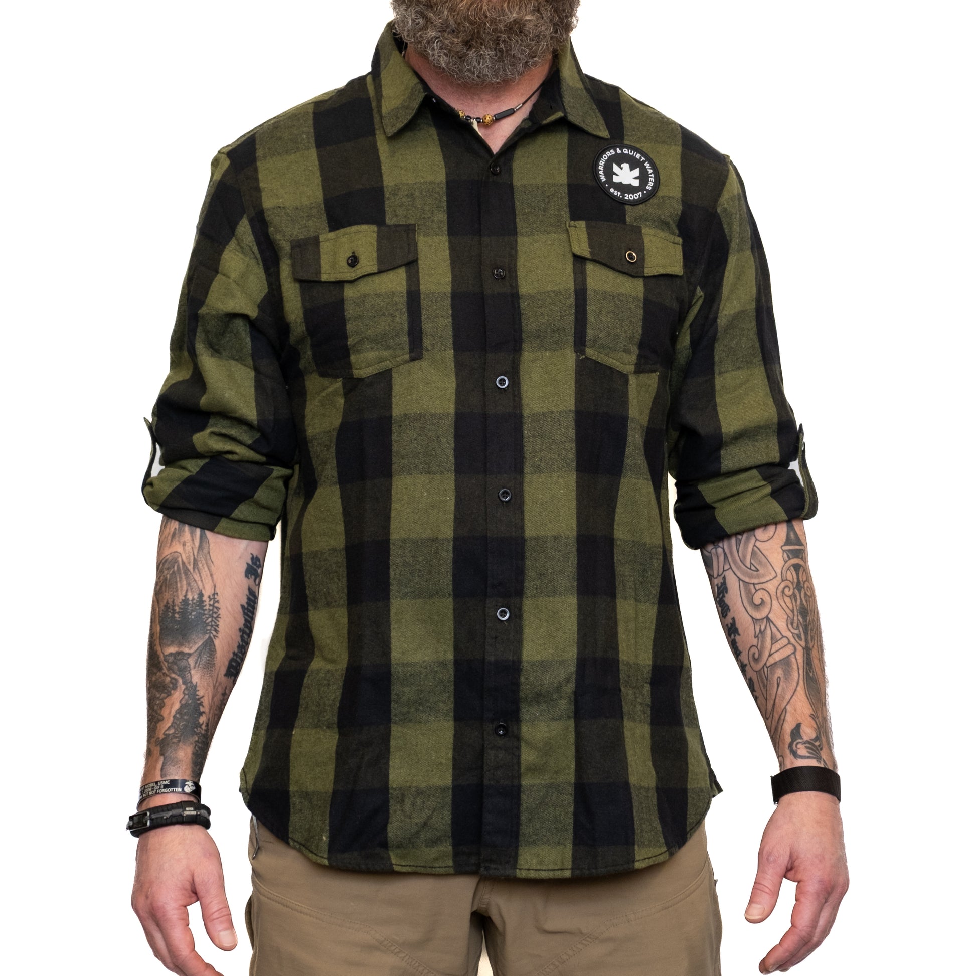 Our Men’s Flannel Button-Down shirts blend everyday comfort with timeless style. Crafted from premium cotton blend flannel, each shirt offers a soft, brushed feel that keeps you warm without weighing you down. Designed with a classic button-front closure, chest pockets, adjustable cuffs, and our Warriors & Quiet Waters patch over your heart, these shirts are perfect for layering, dressing up, AND outdoor adventures!